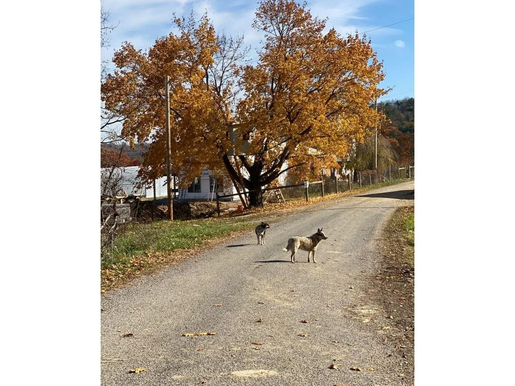 Maca and Lupin wandering the road looking out! This golden Maple is at the corner of our yard! This last week is the last of it's bright brillant yellow! Snow fell on the farm this Monday night!
