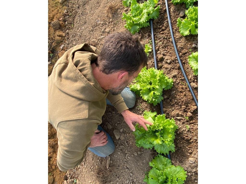 Here Chris is inspecting head lettuce growing in the hoophouse. These will be heads that we will distribute in the fall CSA, and in the fall and winter farmers markets.